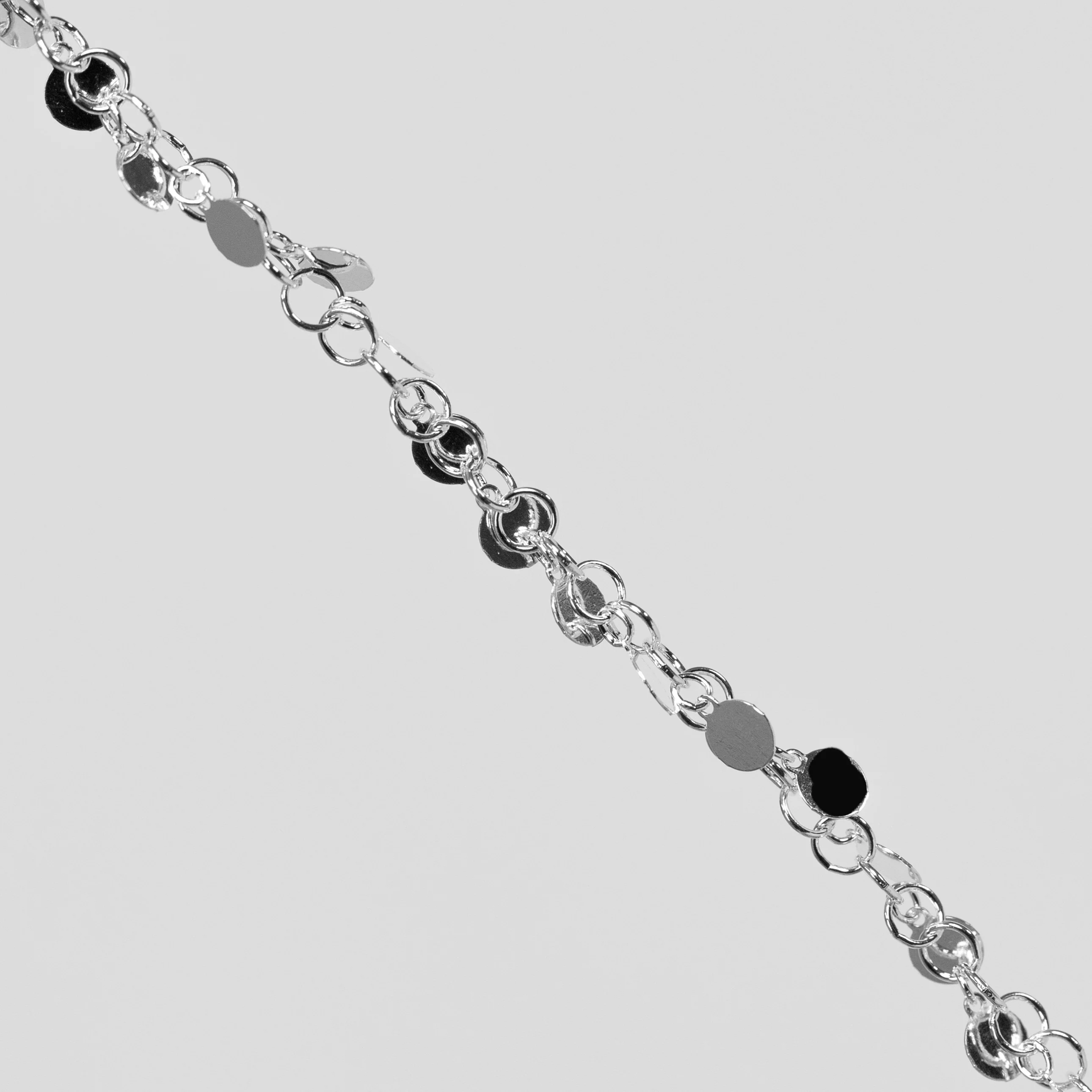 The Melody Chain moves beautifully with the wearer. Classic rolo links provide structure, while evenly spaced 4mm hanging discs add fluid motion and a soft shimmer. It’s playful, graceful, and endlessly wearable.