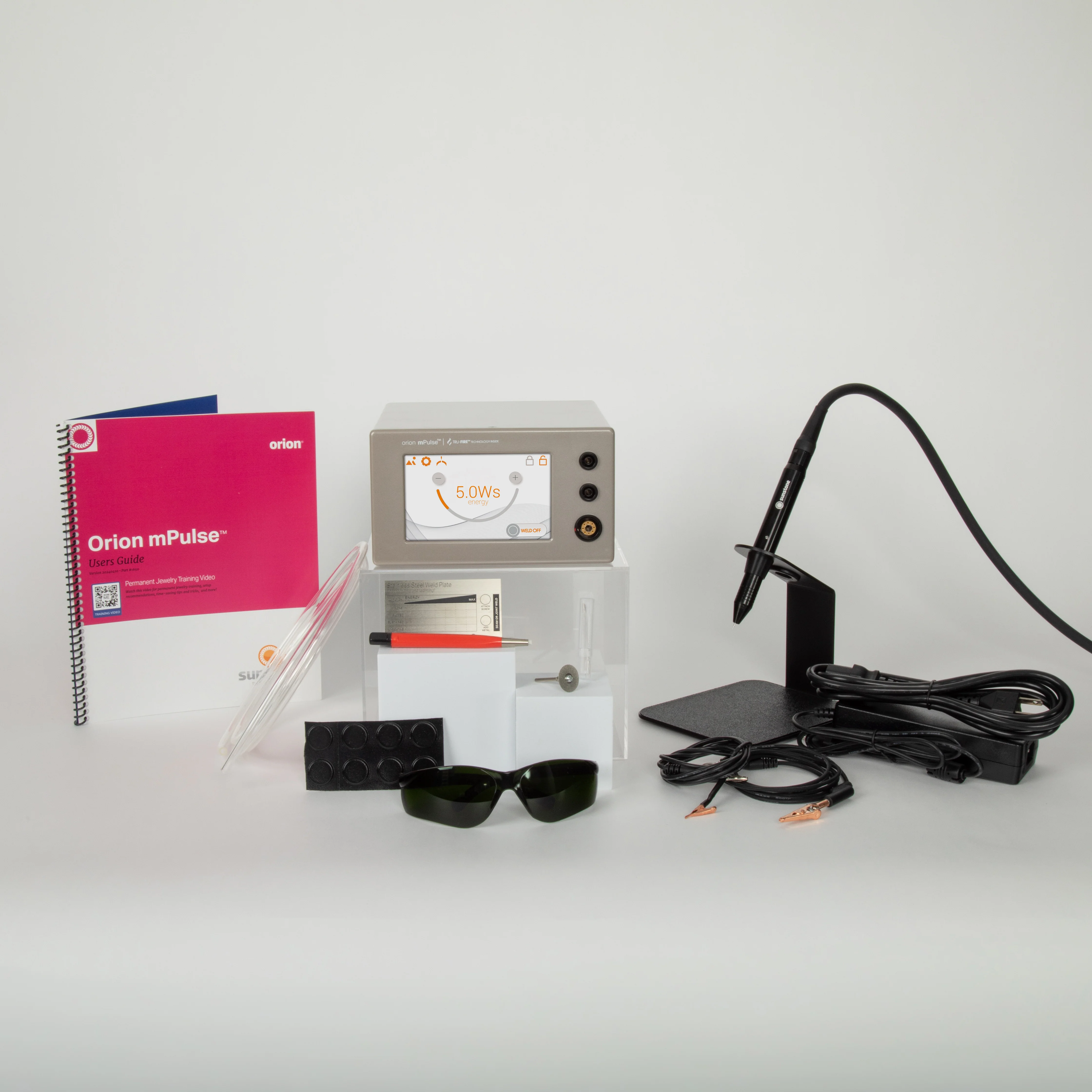 - Orion mPulse® permanent jewelry welder™ with stylus, 1-30 Joule Power Range; 1-15 in 0.5 Joule Increments and 15-30 in 1 Joule Increments